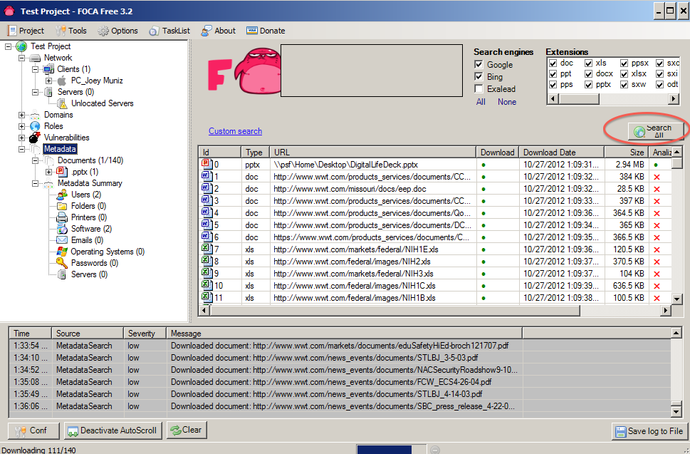 6. Hit the Search All button and FOCA will use search engines to scan for documents.